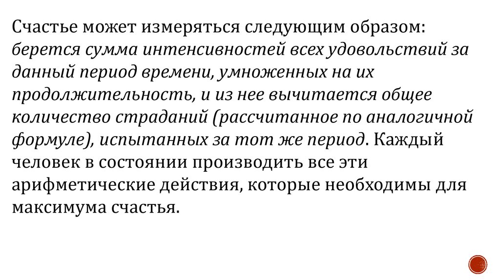 Счастье может измеряться следующим образом:берется сумма интенсивностей всех удовольствий за
