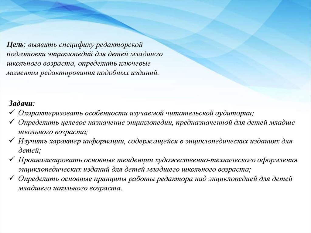Цель: выявить специфику редакторскойподготовки энциклопедий для детей младшего