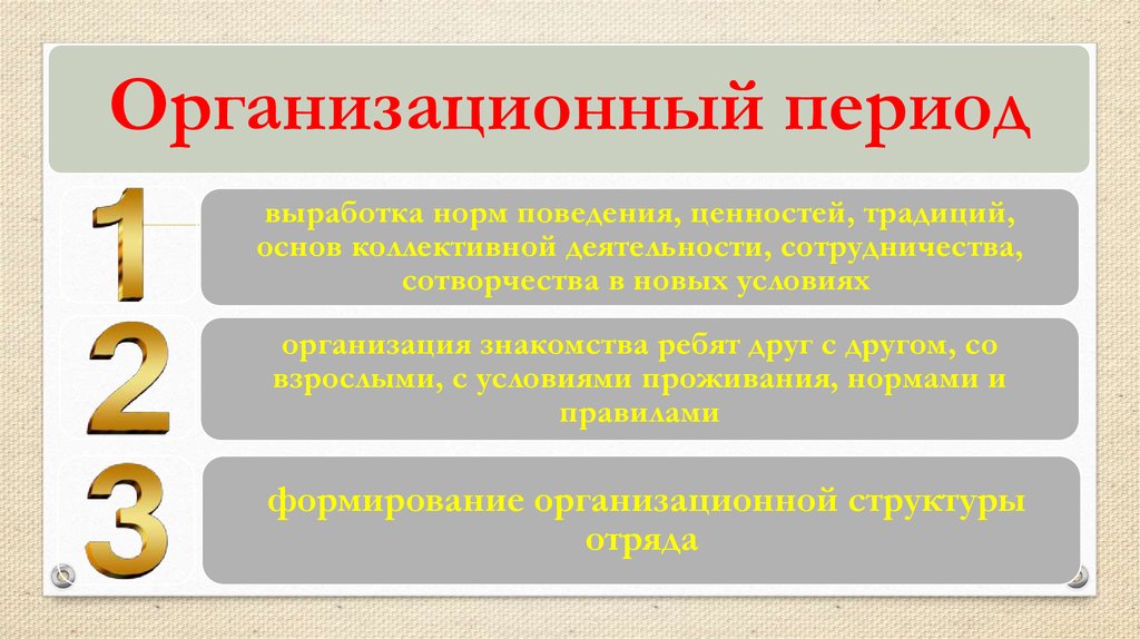 Организационный периодвыработка норм поведения, ценностей, традиций,