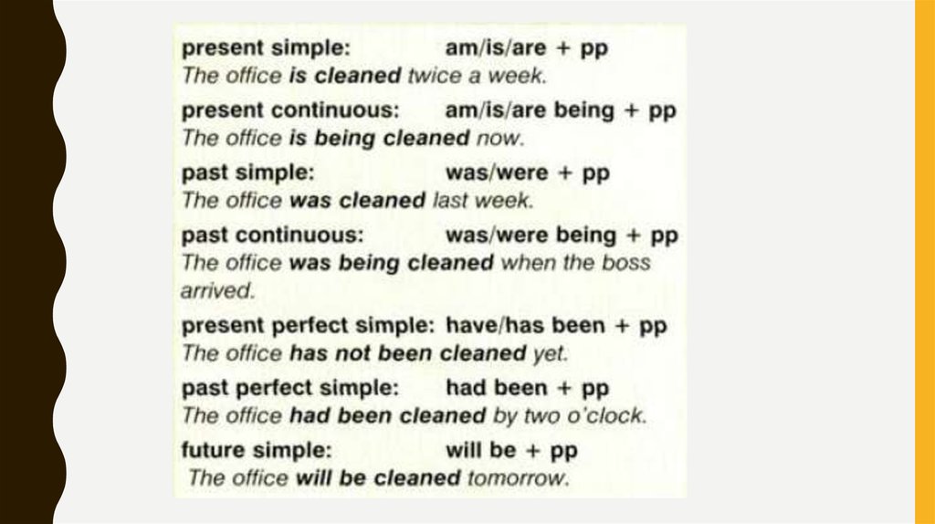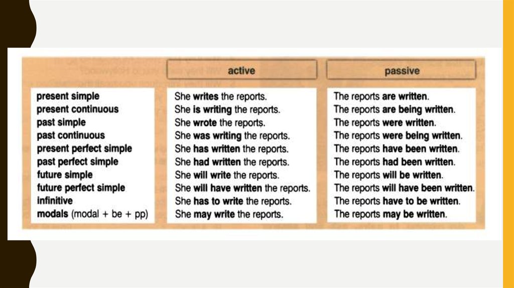 • Глагол актива сменяется в пассивную форму.