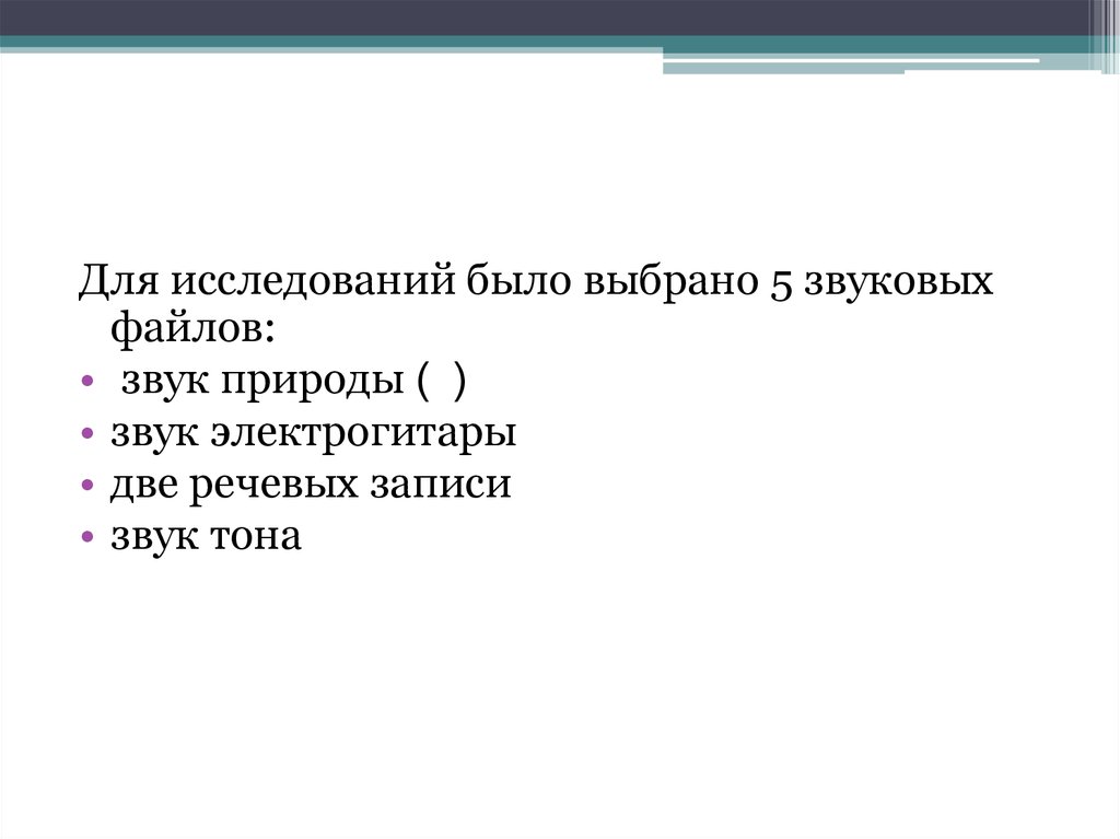 Для исследований было выбрано 5 звуковыхфайлов: