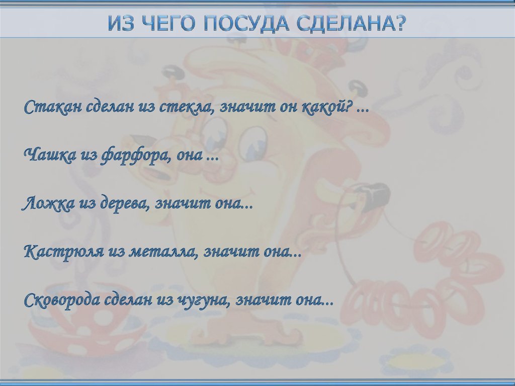 Стакан сделан из стекла, значит он какой? ...Чашка из фарфора, она ...