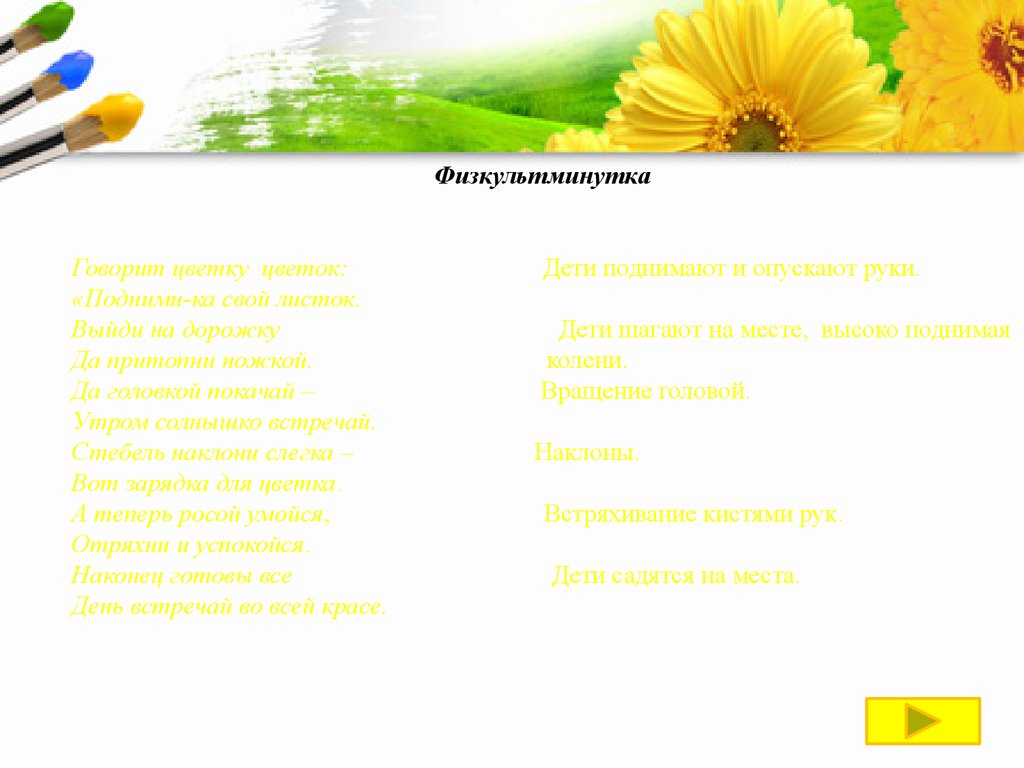 ФизкультминуткаГоворит цветку цветок: Дети поднимают и опускают руки.