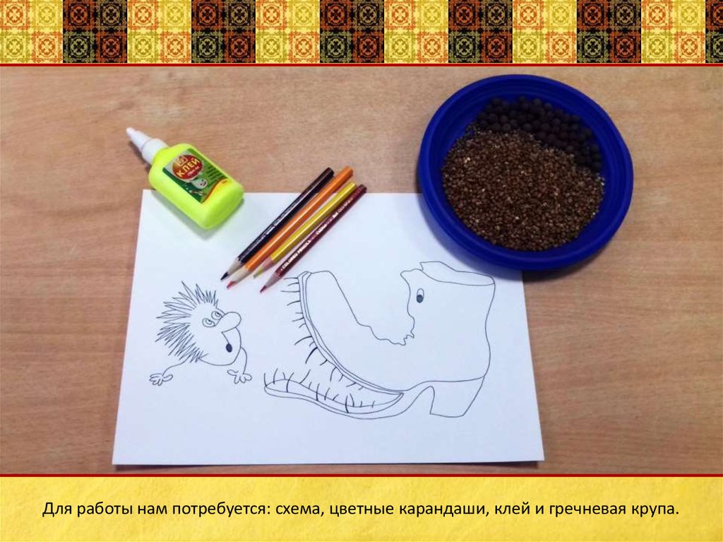 Для работы нам потребуется: схема, цветные карандаши, клей и гречневая крупа.7.