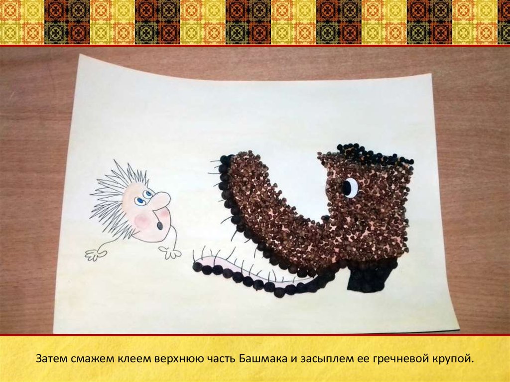 Затем смажем клеем верхнюю часть Башмака и засыплем ее гречневой крупой.9.