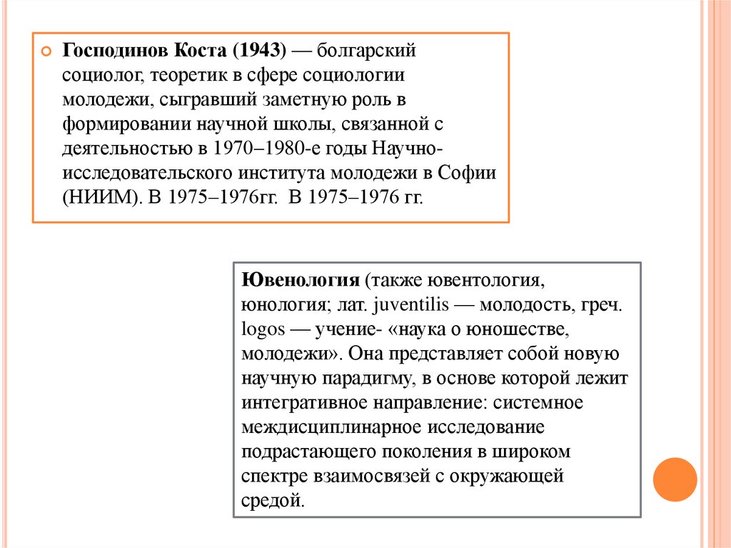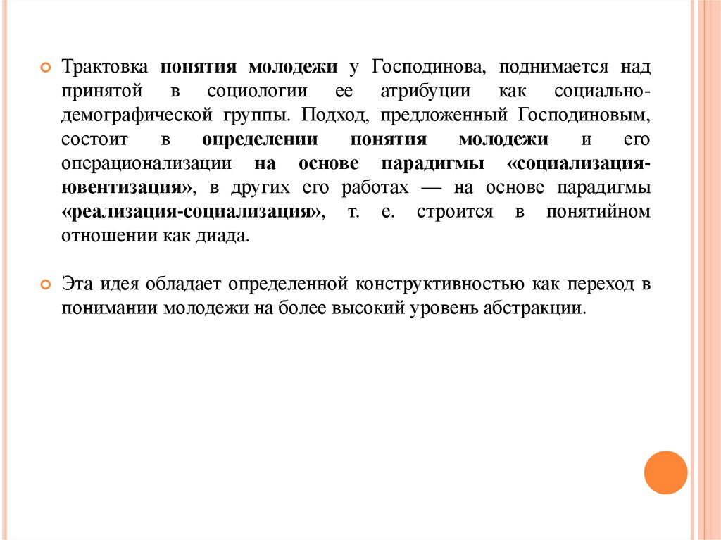 Трактовка понятия молодежи у Господинова, поднимается надпринятой в социологии ее атрибуции как социальнодемографической группы. Подход, предложенный Господиновым,