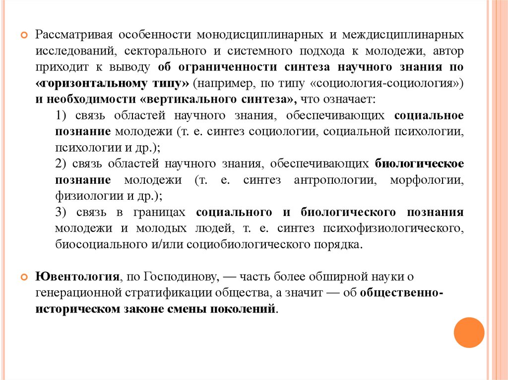 Рассматривая особенности монодисциплинарных и междисциплинарныхисследований, секторального и системного подхода к молодежи, автор
