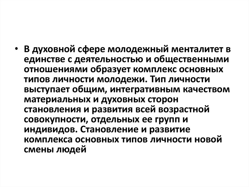 • В духовной сфере молодежный менталитет вединстве с деятельностью и общественными