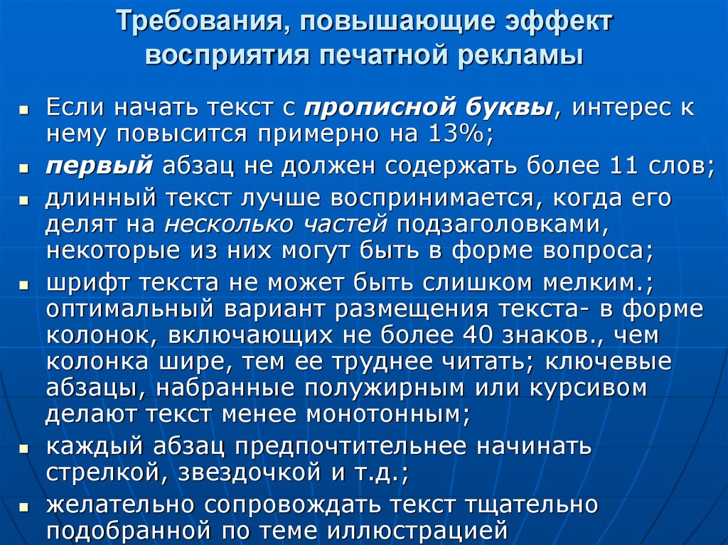 Требования, повышающие эффектвосприятия печатной рекламы