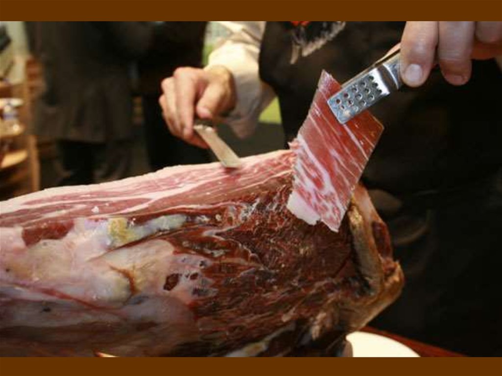 (jamón de bellota). Такой готовят из свиньиаристократа, которая питается желудями от