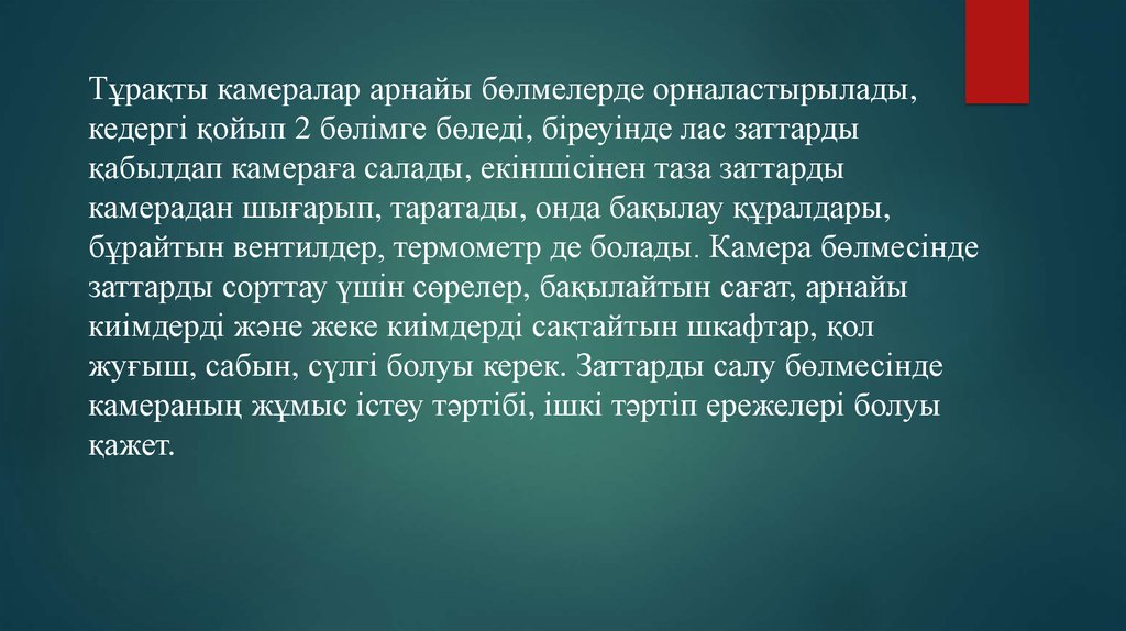 Тұрақты камералар арнайы бөлмелерде орналастырылады,кедергі қойып 2 бөлімге бөледі, біреуінде лас заттарды