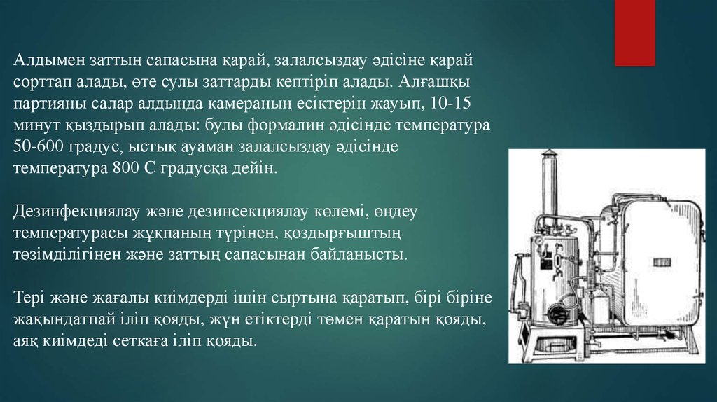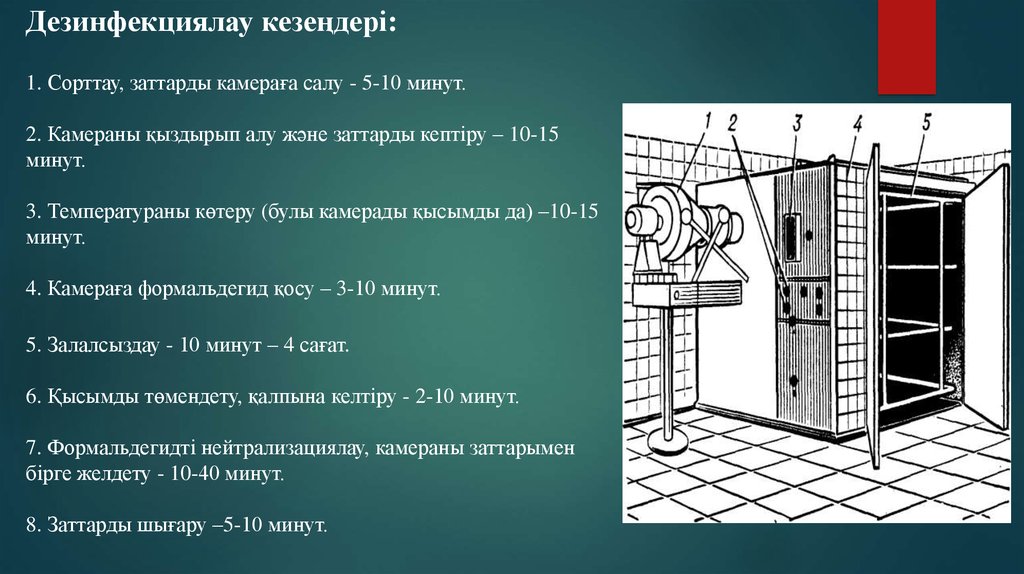 Дезинфекциялау кезеңдері:1. Сорттау, заттарды камераға салу - 5-10 минут.