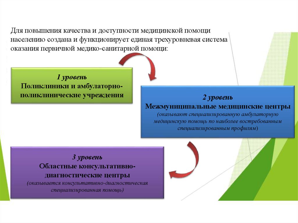 Для повышения качества и доступности медицинской помощинаселению создана и функционирует единая трехуровневая система