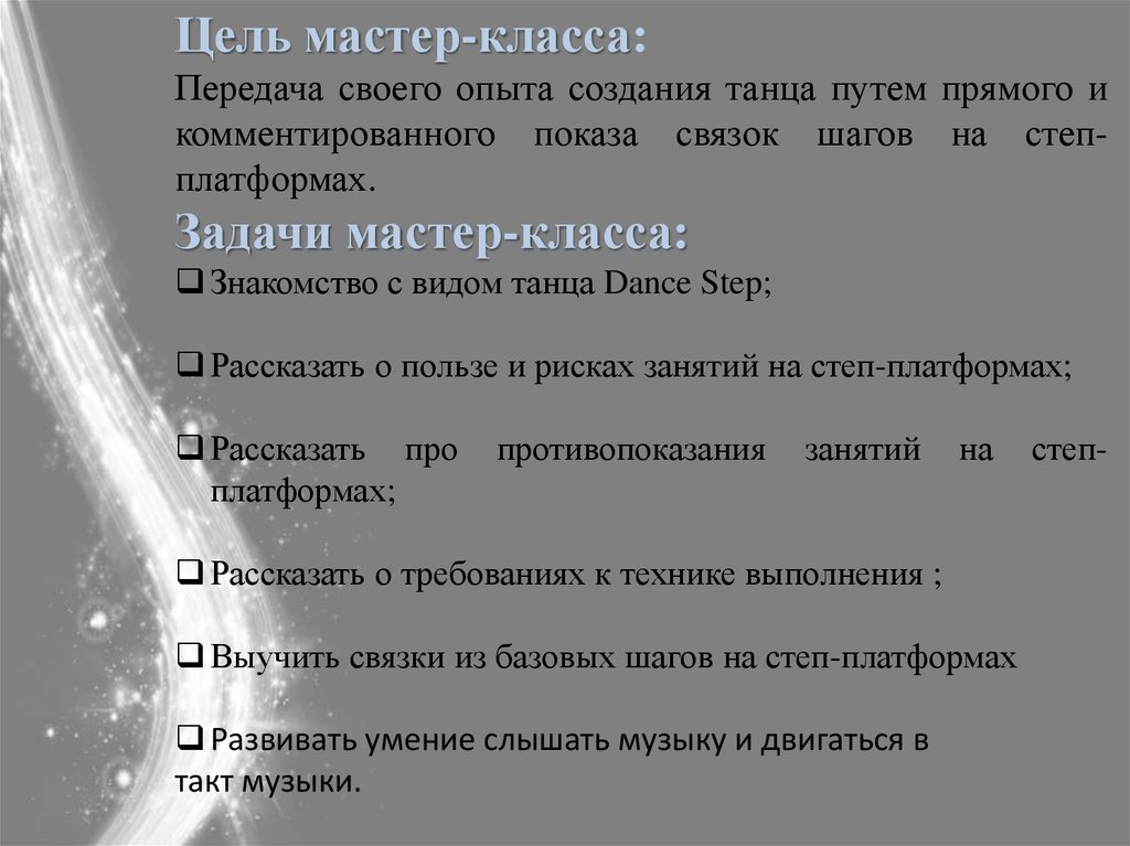 Цель мастер-класса:Передача своего опыта создания танца путем прямого и