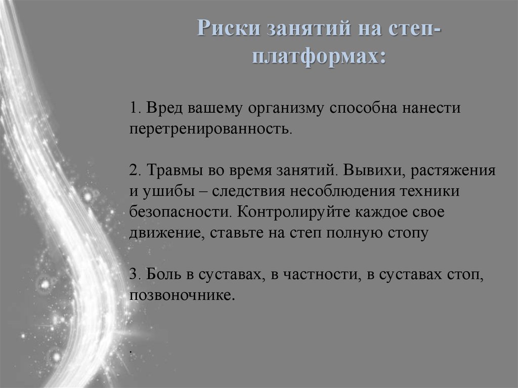 Риски занятий на степплатформах:1. Вред вашему организму способна нанести