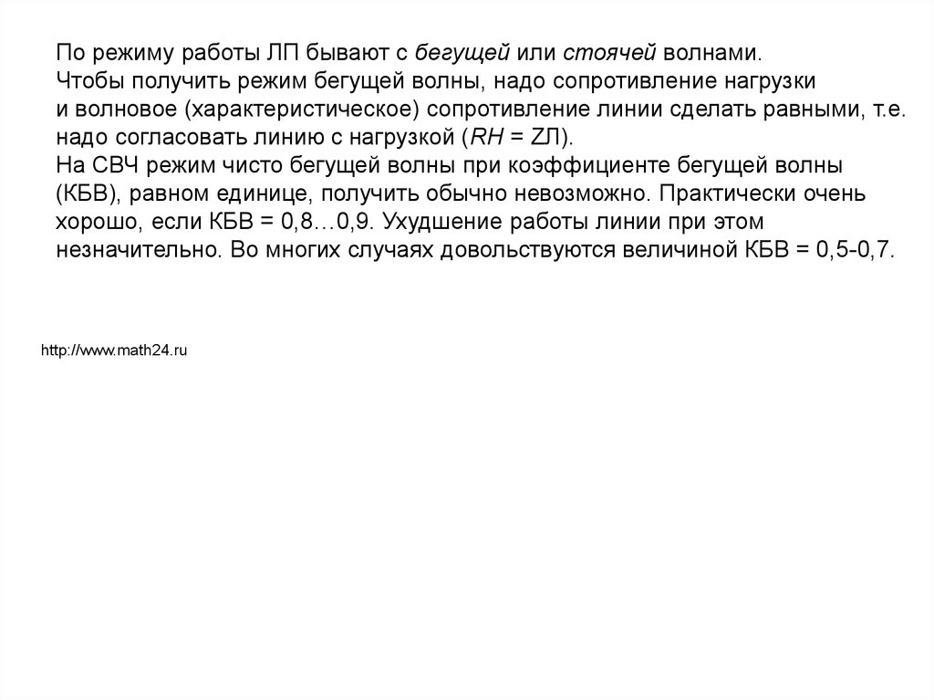 По режиму работы ЛП бывают с бегущей или стоячей волнами.Чтобы получить режим бегущей волны, надо сопротивление нагрузки