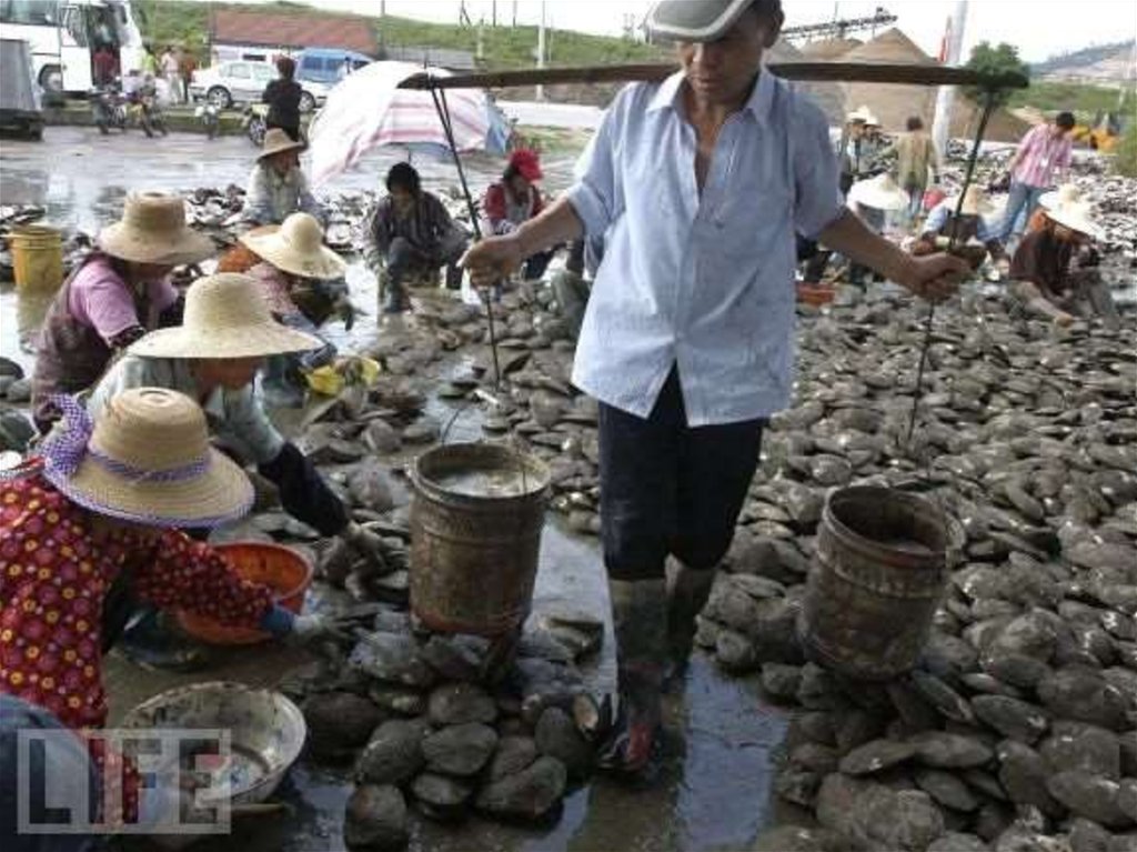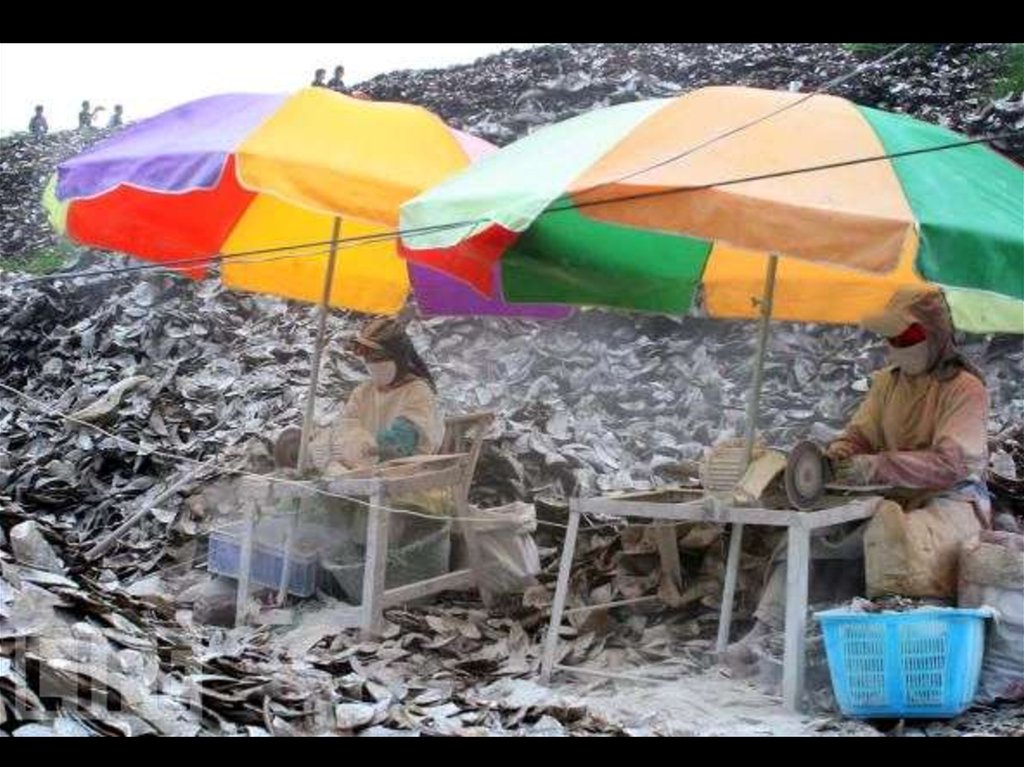Workers process the shells of mollusks aftercollecting pearls from them at a pearl farm on