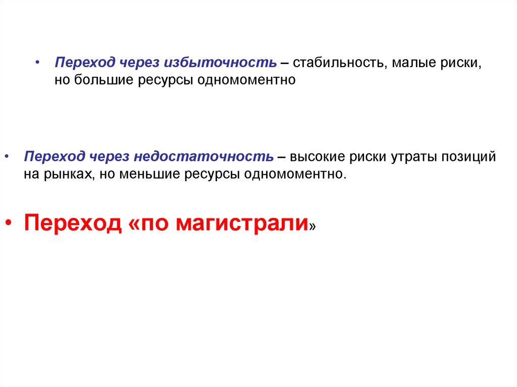• Переход через избыточность – стабильность, малые риски,но большие ресурсы одномоментно