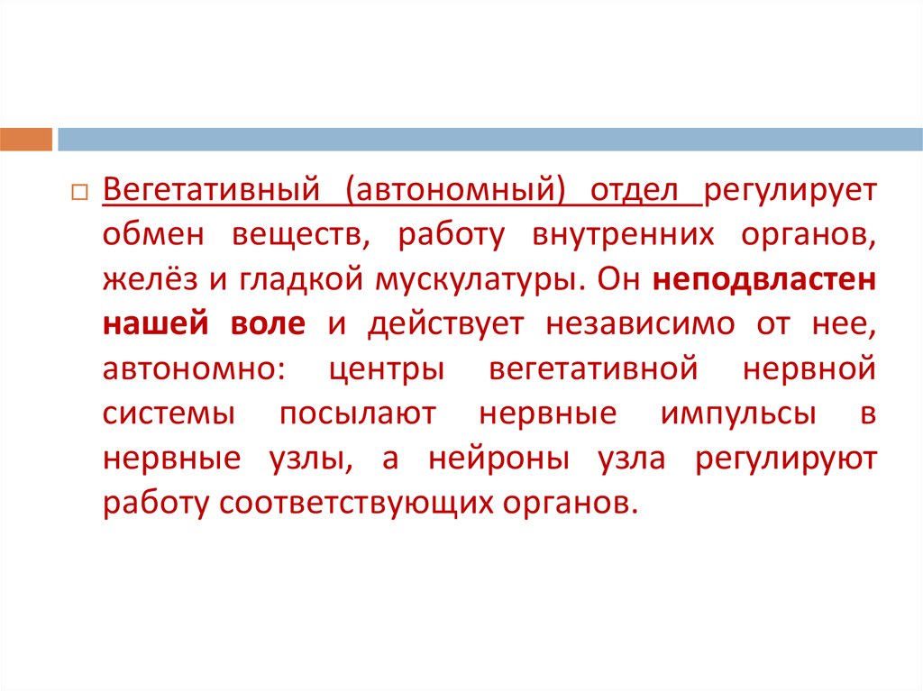 Вегетативный (автономный) отдел регулируетобмен веществ, работу внутренних органов,
