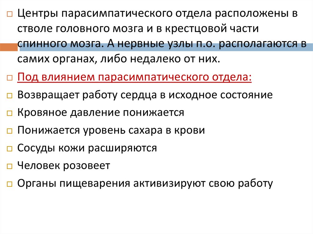 Центры парасимпатического отдела расположены встволе головного мозга и в крестцовой части