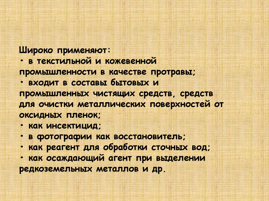 Широко применяют:• в текстильной и кожевенной