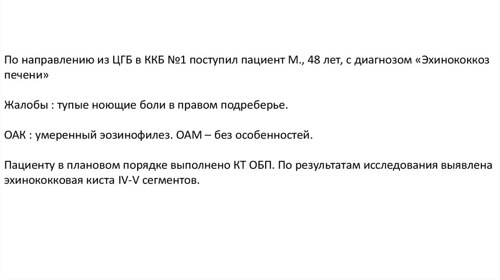 По направлению из ЦГБ в ККБ №1 поступил пациент М., 48 лет, с диагнозом «Эхинококкозпечени»