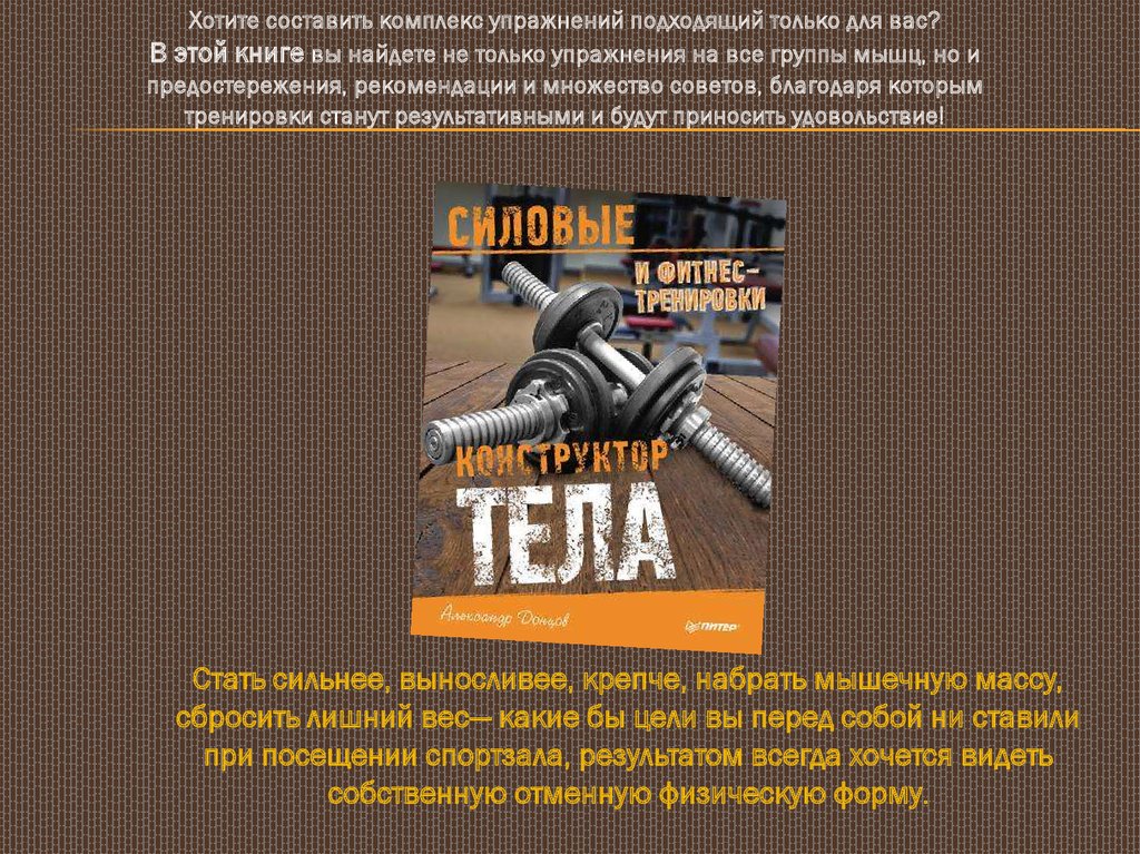 Хотите составить комплекс упражнений подходящий только для вас?В этой книге вы найдете не только упражнения на все группы мышц, но и
