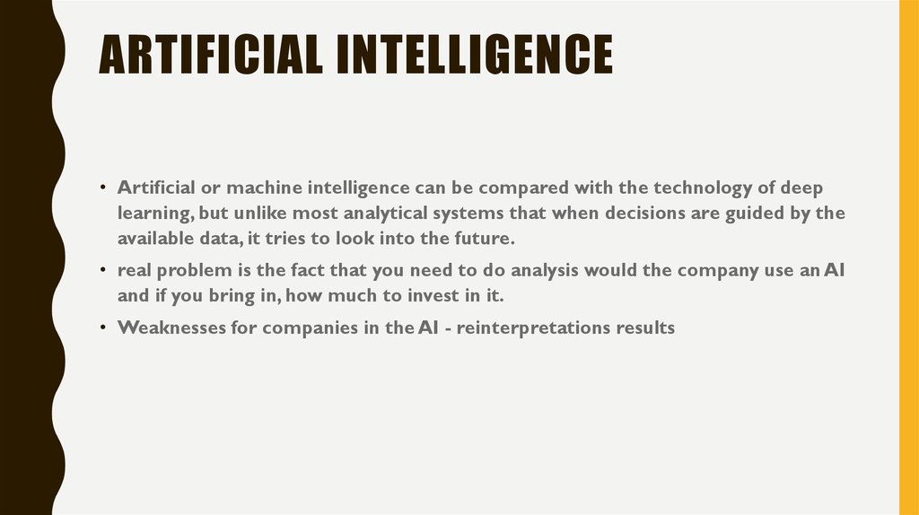 ARTIFICIAL INTELLIGENCE• Artificial or machine intelligence can be compared with the technology of deep