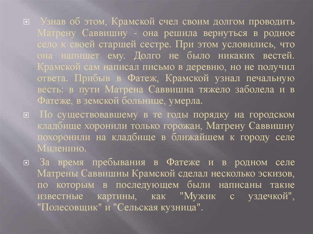 Узнав об этом, Крамской счел своим долгом проводитьМатрену Саввишну - она решила вернуться в родное