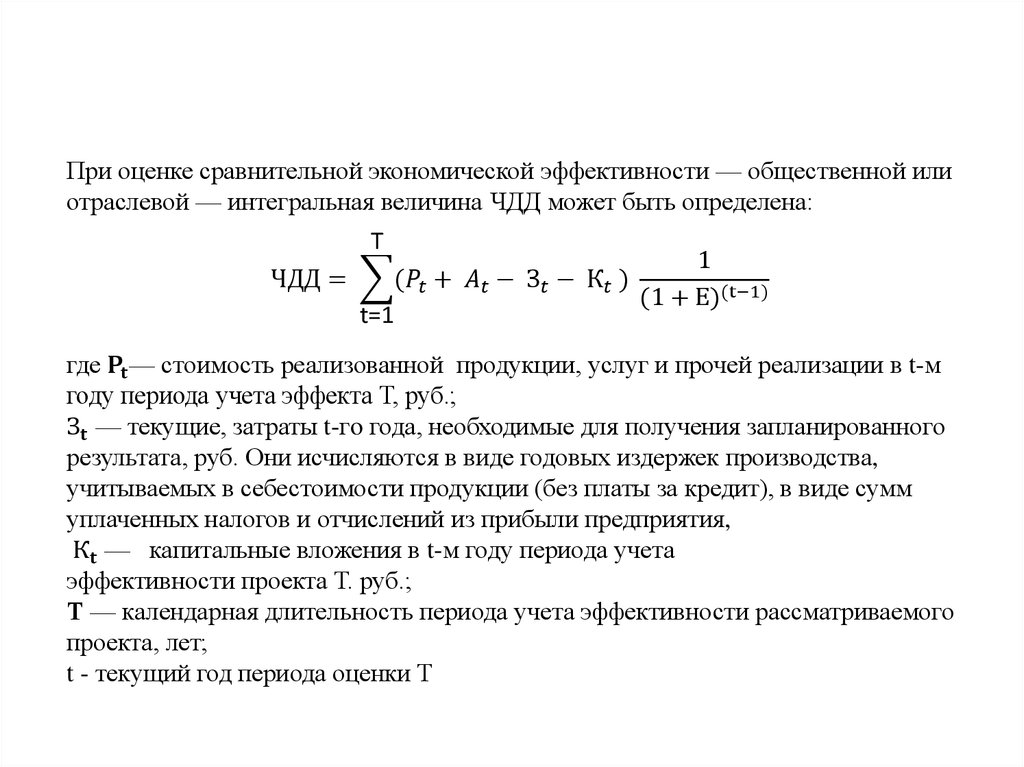При оценке сравнительной экономической эффективности — общественной илиотраслевой — интегральная величина ЧДД может быть определена: