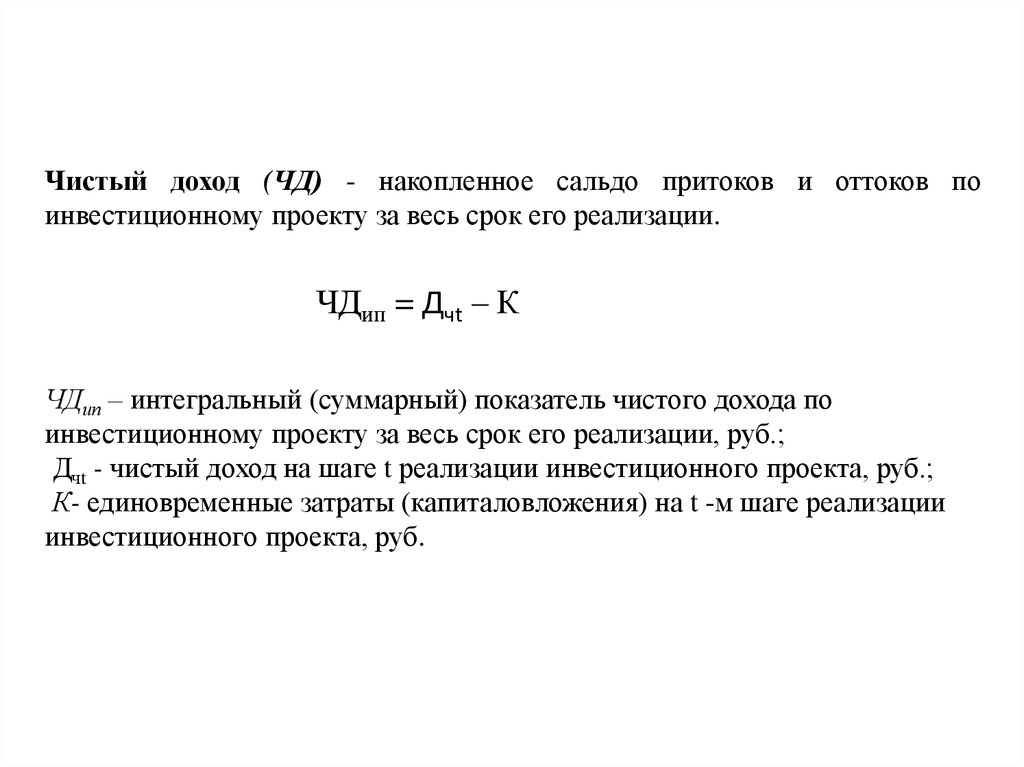 Чистый доход (ЧД) - накопленное сальдо притоков и оттоков поинвестиционному проекту за весь срок его реализации.
