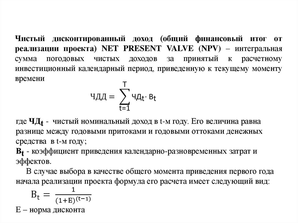 Чистый дисконтированный доход (общий финансовый итог отреализации проекта) NET PRESENT VALVE (NPV) – интегральная
