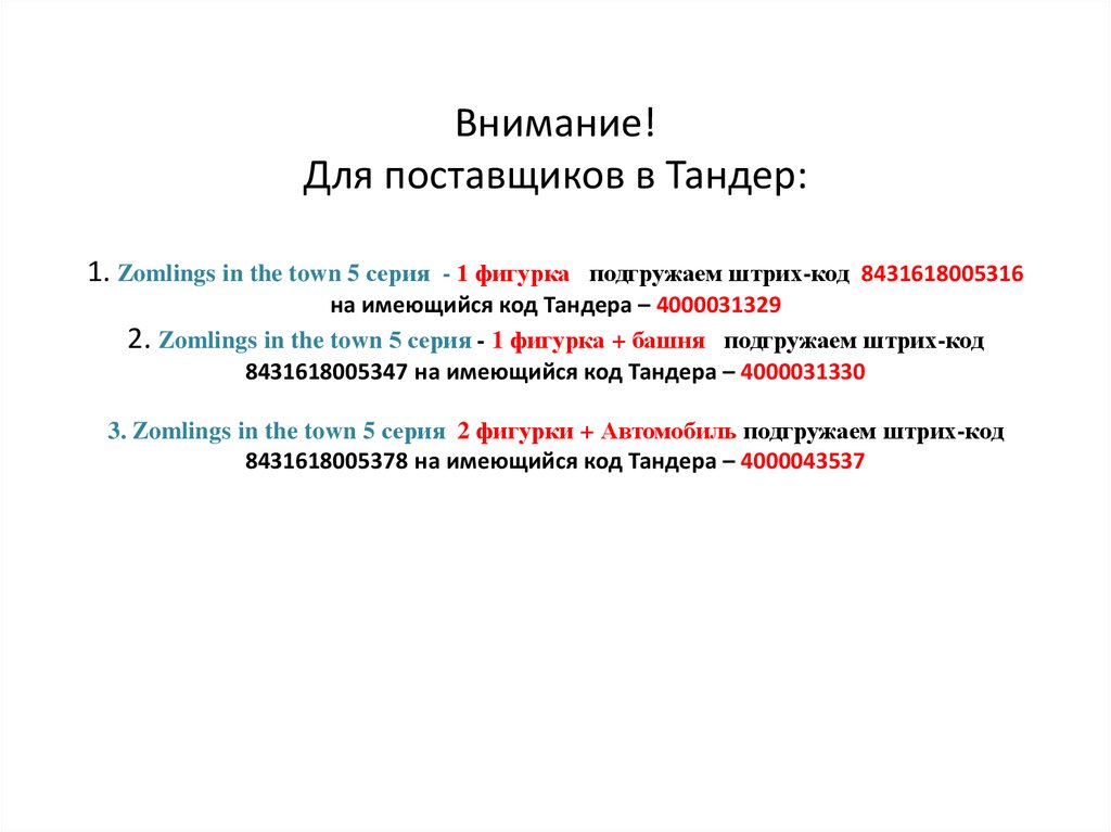 7. Внимание! Для поставщиков в Тандер: 1. Zomlings in the town 5 серия - 1 фигурка подгружаем штрих-код 8431618005316 на имеющийся