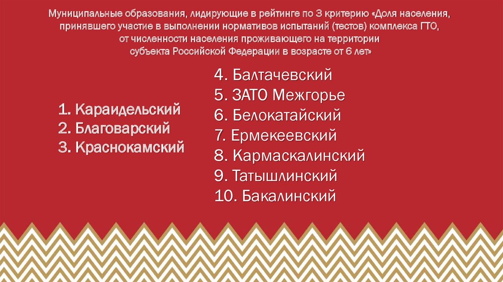 Муниципальные образования, лидирующие в рейтинге по 3 критерию «Доля населения,принявшего участие в выполнении нормативов испытаний (тестов) комплекса ГТО,