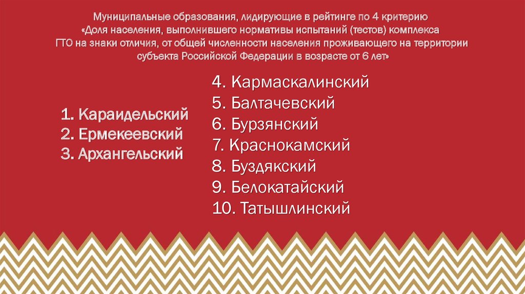 Муниципальные образования, лидирующие в рейтинге по 4 критерию«Доля населения, выполнившего нормативы испытаний (тестов) комплекса