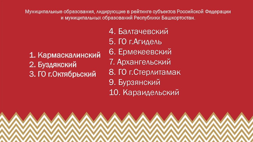 Муниципальные образования, лидирующие в рейтинге субъектов Российской Федерациии муниципальных образований Республики Башкортостан.