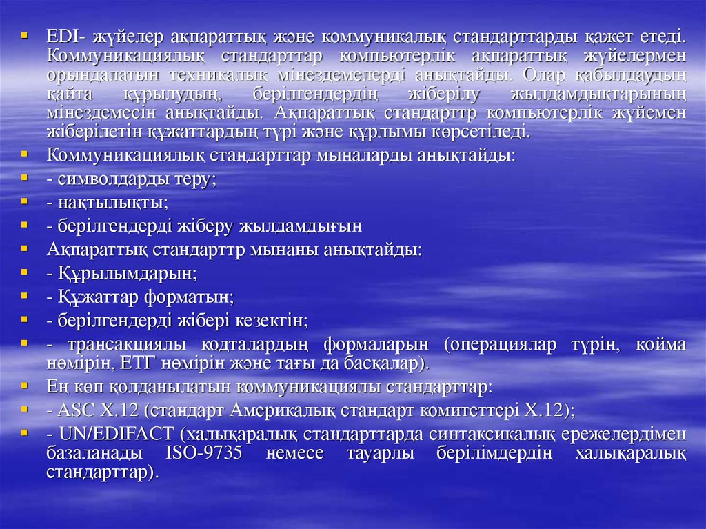 EDI- жүйелер ақпараттық және коммуникалық стандарттарды қажет етеді.Коммуникациялық стандарттар компьютерлік ақпараттық жүйелермен