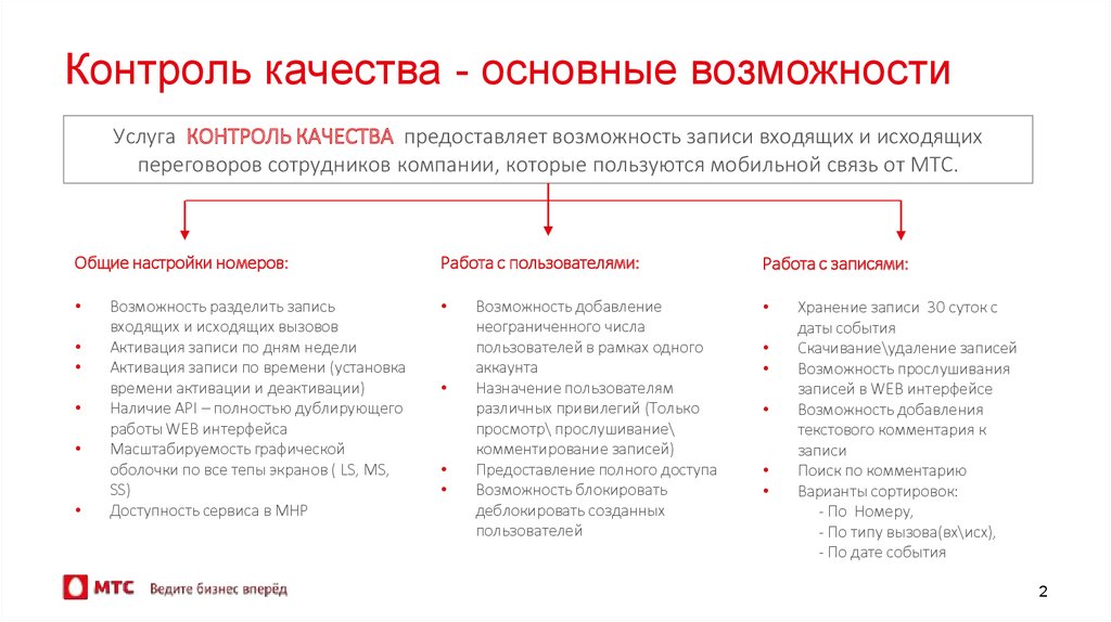 Контроль качества - основные возможностиУслуга КОНТРОЛЬ КАЧЕСТВА предоставляет возможность записи входящих и исходящих