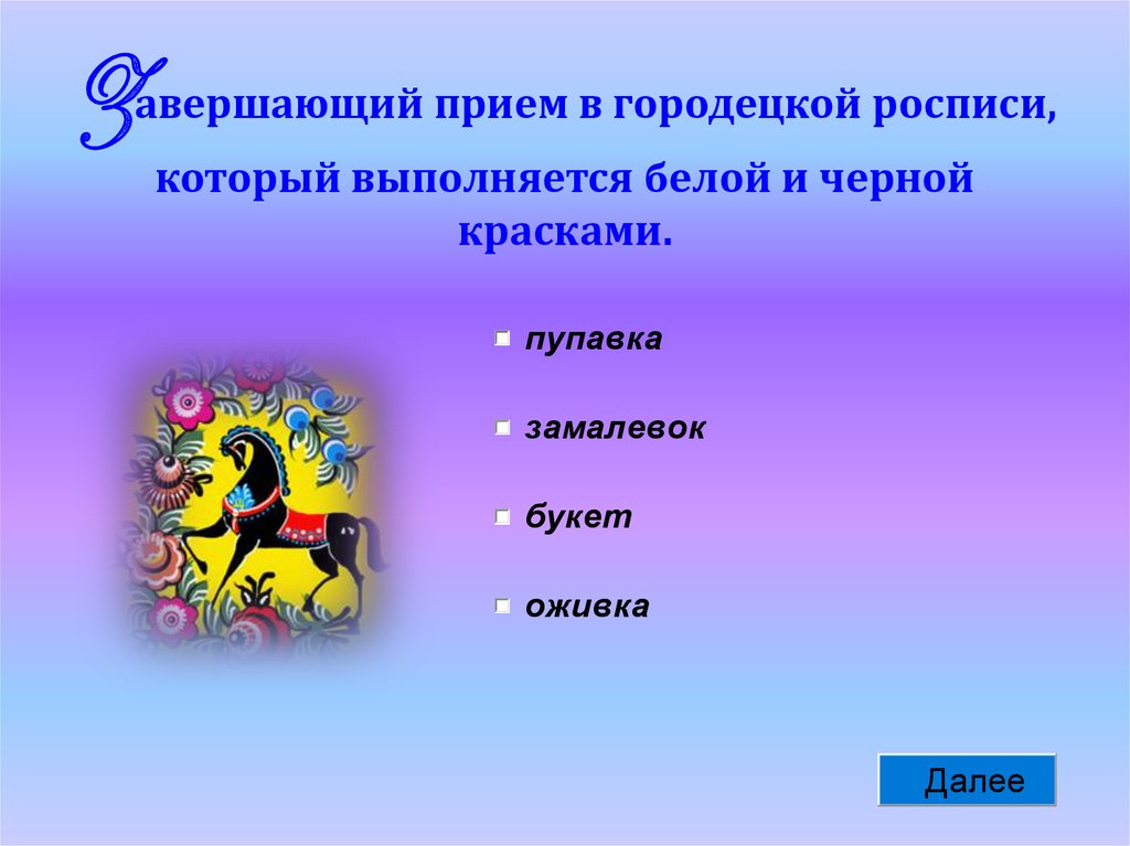 Zавершающий прием в городецкой росписи,который выполняется белой и черной