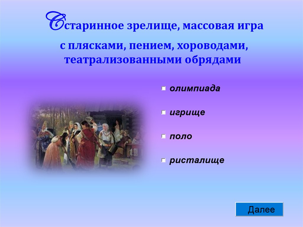C старинное зрелище, массовая играс плясками, пением, хороводами,