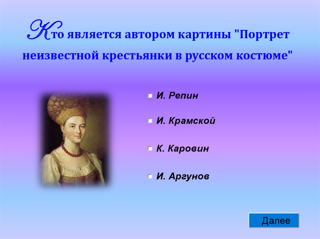 K то является автором картины "Портретнеизвестной крестьянки в русском костюме"