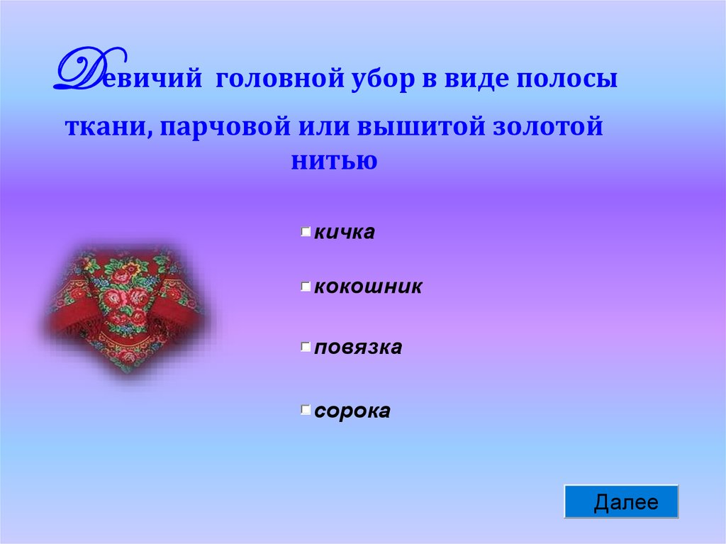 Dевичий головной убор в виде полосыткани, парчовой или вышитой золотой