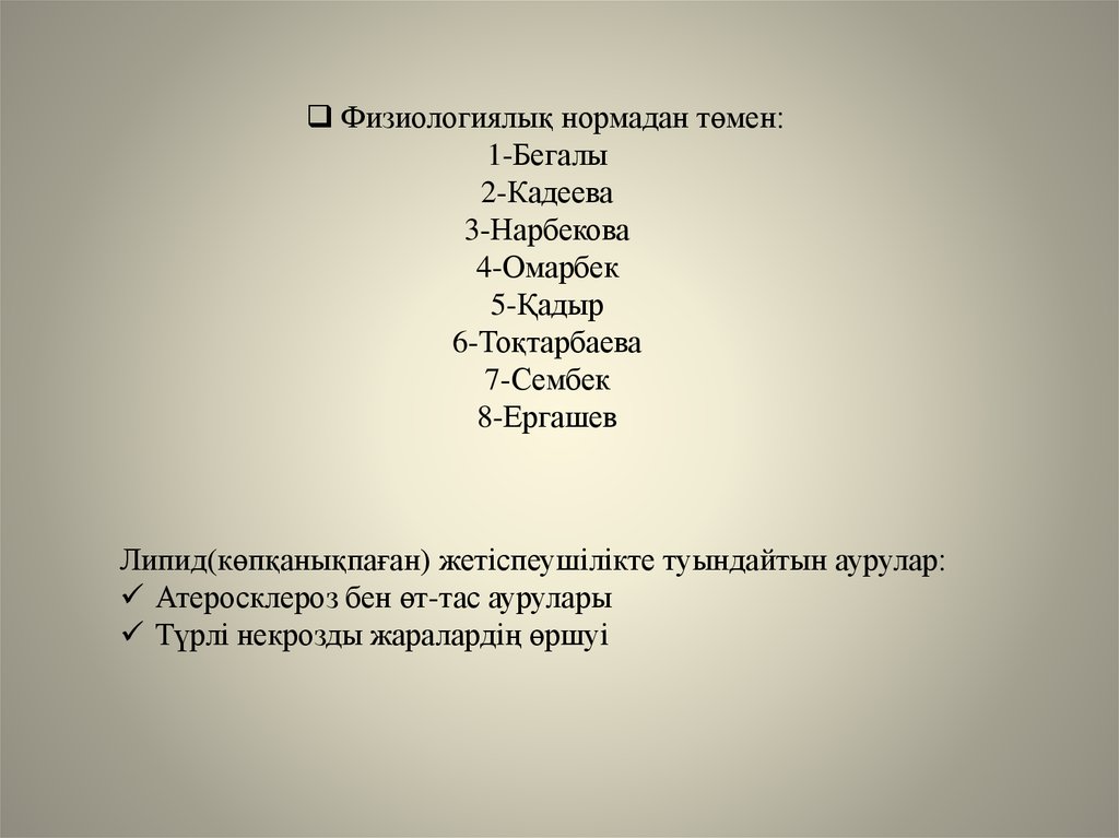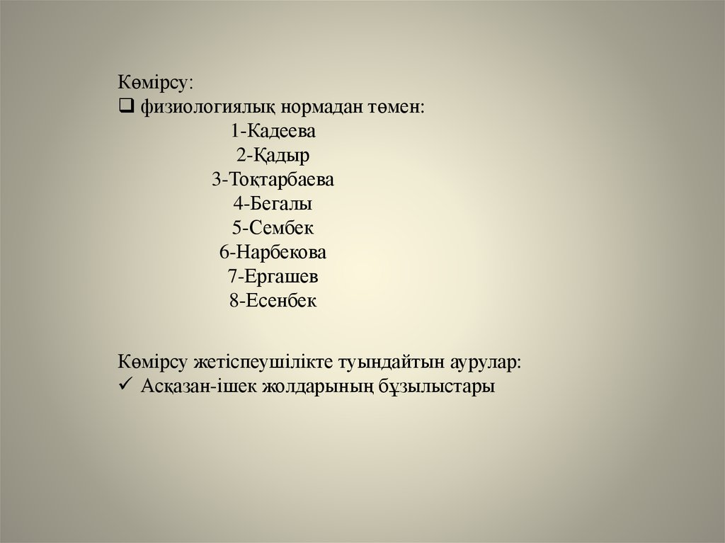 Физиологиялық нормадан төмен:1-Бегалы