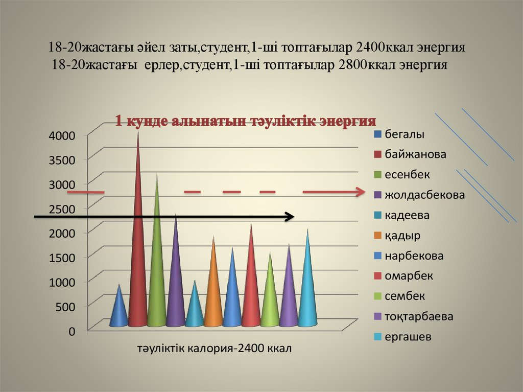 18-20жастағы әйел заты,студент,1-ші топтағылар 2400ккал энергия18-20жастағы ерлер,студент,1-ші топтағылар 2800ккал энергия