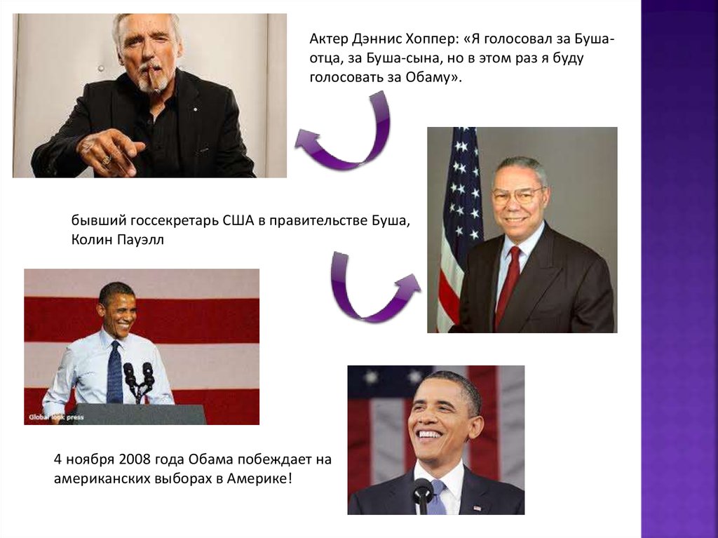 Актер Дэннис Хоппер: «Я голосовал за Бушаотца, за Буша-сына, но в этом раз я будуголосовать за Обаму».