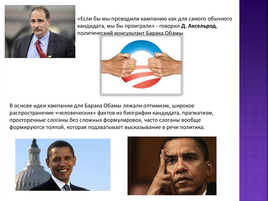 «Если бы мы проводили кампанию как для самого обычногокандидата, мы бы проиграли» - говорил Д. Аксельрод,