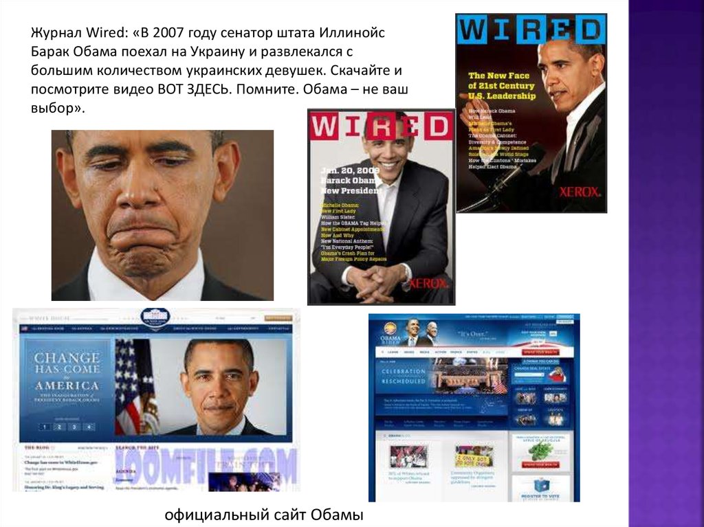 Журнал Wired: «В 2007 году сенатор штата ИллинойсБарак Обама поехал на Украину и развлекался с