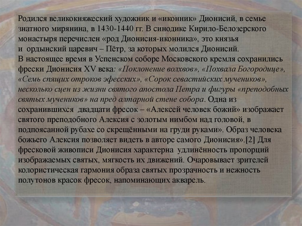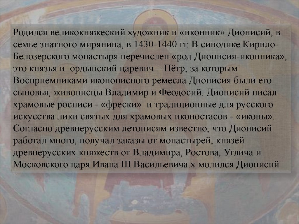 Родился великокняжеский художник и «иконник» Дионисий, всемье знатного мирянина, в 1430-1440 гг. В синодике КирилоБелозерского монастыря перечислен «род Дионисия-иконника»,