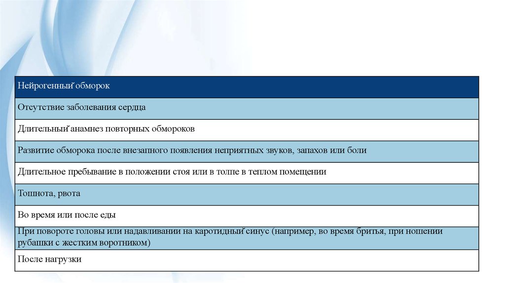 Классификация обмороковРефлекторный(нейрогенный) обморок
