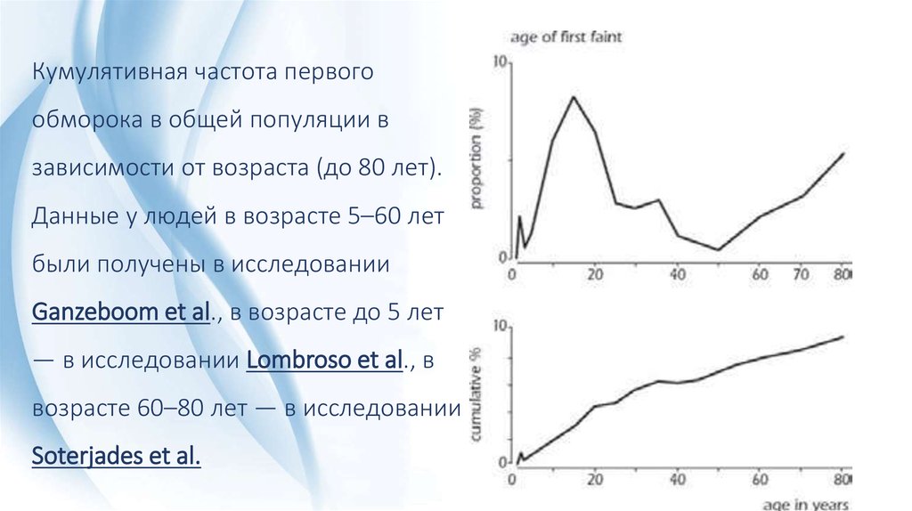 Первый̆ обморок часто развивается в возрасте от 10 до 30 лет;максимальная частота отмечается в возрасте 15 лет (у 47% женщин и 31%